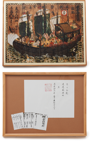 This gaku-ema (large wooden wishing plaque) bearing a drawing of a shogunate-licensed trading ship was an offering made in September 1632 by the Sueyoshi family to Kiyomizu-dera Temple in Kyoto.