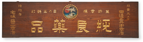 This is the signboard of a Tanabe Gohei Shoten distributor, featuring the "Hinode Tsuru (Rising sun and crane)” emblem, and it was sent to Takumi Yakyoku, a distributor, by Tanabe Gohei Shoten around 1932.