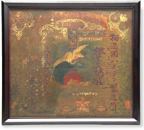 Tanabeya Gohei XII obtained sole distribution rights from Kobe trading company H. Ahrens & Co. for salicylic acid manufactured by German drug company Chemische Fabrik von Heyden. He named this product “Hinode Tsurukame Jirushi sarichiru-san (Rising Sun, Crane, and Tortoise Mark salicylic acid)” and began to sell it to sake brewers as a sake preservative. Note the crane depicted in the middle section, followed by the tortoise and rising sun.
