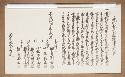 HOME 収蔵品のご紹介 くすりの 道修町ゾーン あゆみゾーン 永代家屋敷親類譲証文(えいだいやしきしんるいゆずりしょうもん) 16/24 11代田邊屋五兵衛が親類である田邊屋利兵衛より道修町3丁目の屋敷(現在の本社所在地)を譲り渡された時の証文です。 時代 1855年(安政2年) サイズ 242×410 収蔵品一覧に戻る