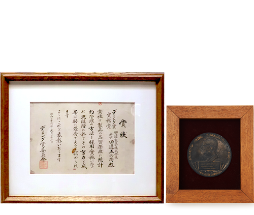 HOME 収蔵品のご紹介 くすりの 道修町ゾーン あゆみゾーン 日本科学技術連盟デミング賞委員会から贈られた実施賞賞状並びにメダル 18/24 1950年(昭和25年)にW・E・デミング博士(米国ニューヨーク大学)が、日本で初めて「統計的品質管理手法」の講演をされたのを記念して創設された賞です。 当社は博士の指導による、「統計的品質管理手法」の実施に優れた企業として、第1回目の受賞をしました。 時代 1950年(昭和25年) 収蔵品一覧に戻る