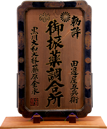 HOME 収蔵品のご紹介 くすりの 道修町ゾーン あゆみゾーン 勅許看板(ちょっきょかんばん) 7/24 初代田邊屋五兵衞は、長年の朝廷御用「禁裏御用」を務め、また、「たなべや薬」が大変好評でもあり、朝廷より「黒川大和大椽藤原金永」の称号を賜りました。 ※「禁裏御用」:現在の「宮内庁ご用達」と言った意昧で、薬を朝廷(天皇家)に収め、当時は大変名誉な事でした。 時代 1700年(元禄13年)頃 サイズ 1310×820×180 収蔵品一覧に戻る